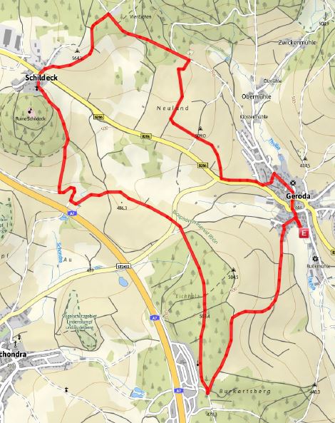 Rund um Geroda auf Natur-, Schotter- und wenigen Asphaltwegen. Durch sommerliche Wiesen und Laubwälder mit Panoramablick auf die Südrhön.