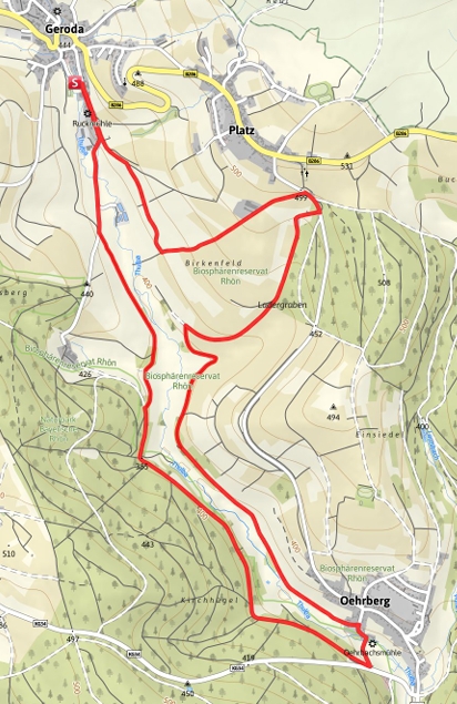 Rund um Geroda auf Natur-, Schotter- und wenigen Asphaltwegen. Durch sommerliche Wiesen und Laubwälder mit Panoramablick auf die Südrhön.