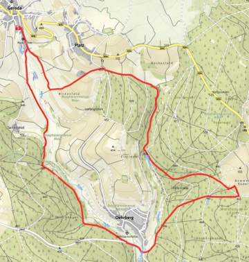 Rund um Geroda auf Natur-, Schotter- und wenigen Asphaltwegen. Durch sommerliche Wiesen und Laubwälder mit Panoramablick auf die Südrhön.
